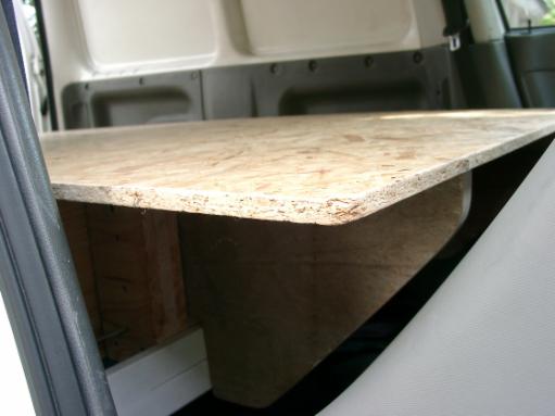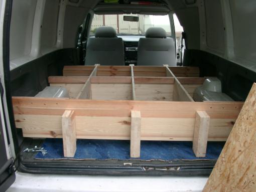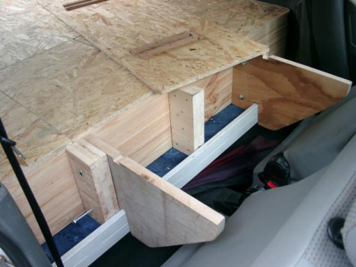 Die Boxen sind also entnehmbar und außerhalb das Caddys zu beladen. Beim hochstehenden Deckel (übrigens Grobspanplatte, natürlich mit der geschliffenen Seite nach oben) sind gut die Leisten zu erkennen die ein Verrutschen auf dem Fach verhindern. In den äußeren Fächern an den Radkästen können Werkzeug, Warndreieck, Verbandkasten, Feuerlöscher und was man sonst noch so mitschleppt deponiert werden. Die (langen) Fächer innen nehmen z.B. ein zusätzliches Zelt oder Paddel oder, oder, oder...auf.