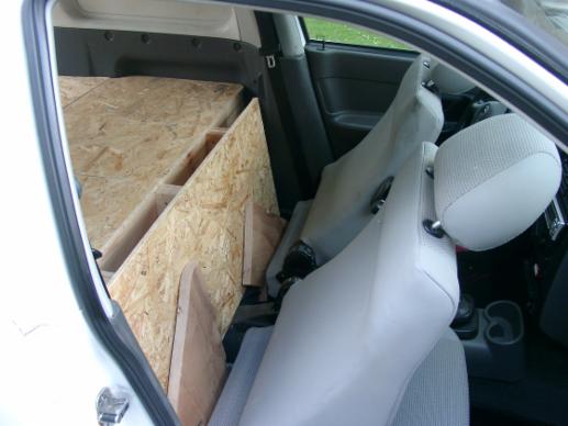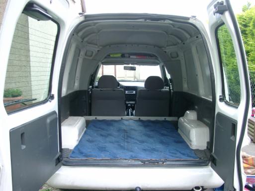 So sieht der Laderaum mit eingebauter Liegefläche aus. Volle Breite von ca. 1,40 Meter nutzbar. Die B-Säulen haben immer noch ein lichtes Maß von 1,25 Meter. Eine selbstaufblasende 2er Luftmatratze passt locker dazwischen. Die vorderen Fächer sind passgenau für Faltboxen gebaut.