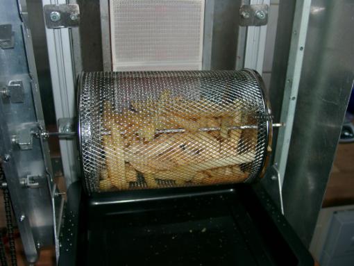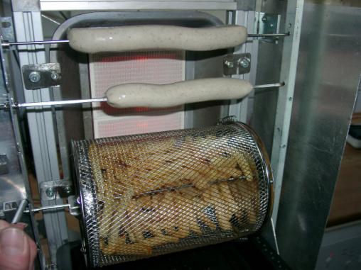 Hier in Verbindung mit der zweiten Zutat zum Deutschen Nationalgericht: Currywurst - Pommes. Zwar noch nicht perfekt, aber es wird noch dran gearbeitet. Es geht latürnich auch alles was sich auf einen Spieß stecken lässt wie z.B. Schaschlik. Und in den Korb passt auch Gemüse oder ähnl.
