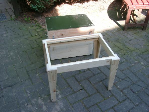 Die Kiste oben drauf heben. Alles durchdacht das sie genau in den Rahmen passt und fest steht